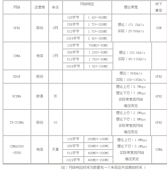 无线蜂窝网络,主要指的是移动、联通、电信所提供的GPRS、CDMA、TD-SCDMA、CDMA2000、WCDMA等。就目国内的情况来看,三大运营商各自运营一个3G网络,详细参数见下表(以下参数仅供参考) http://bbs.sendsms.com.cn/attachment...1&d=1327934378 (注:网络响应时间为数据包一个来回总共话费的时间 ) |