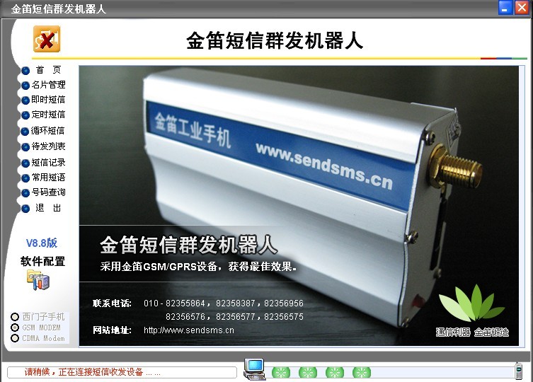 "金笛短信机器人"银行短信服务平台集成多路短信收发通信器(短信猫设备),对外可以与多个移动运营商的短信中心建立多路无线连接,对内通过短信王服务器及其软件开发包与银行业务系统无缝集成。